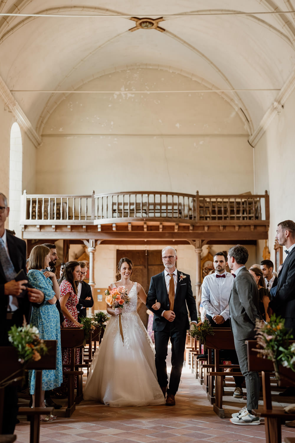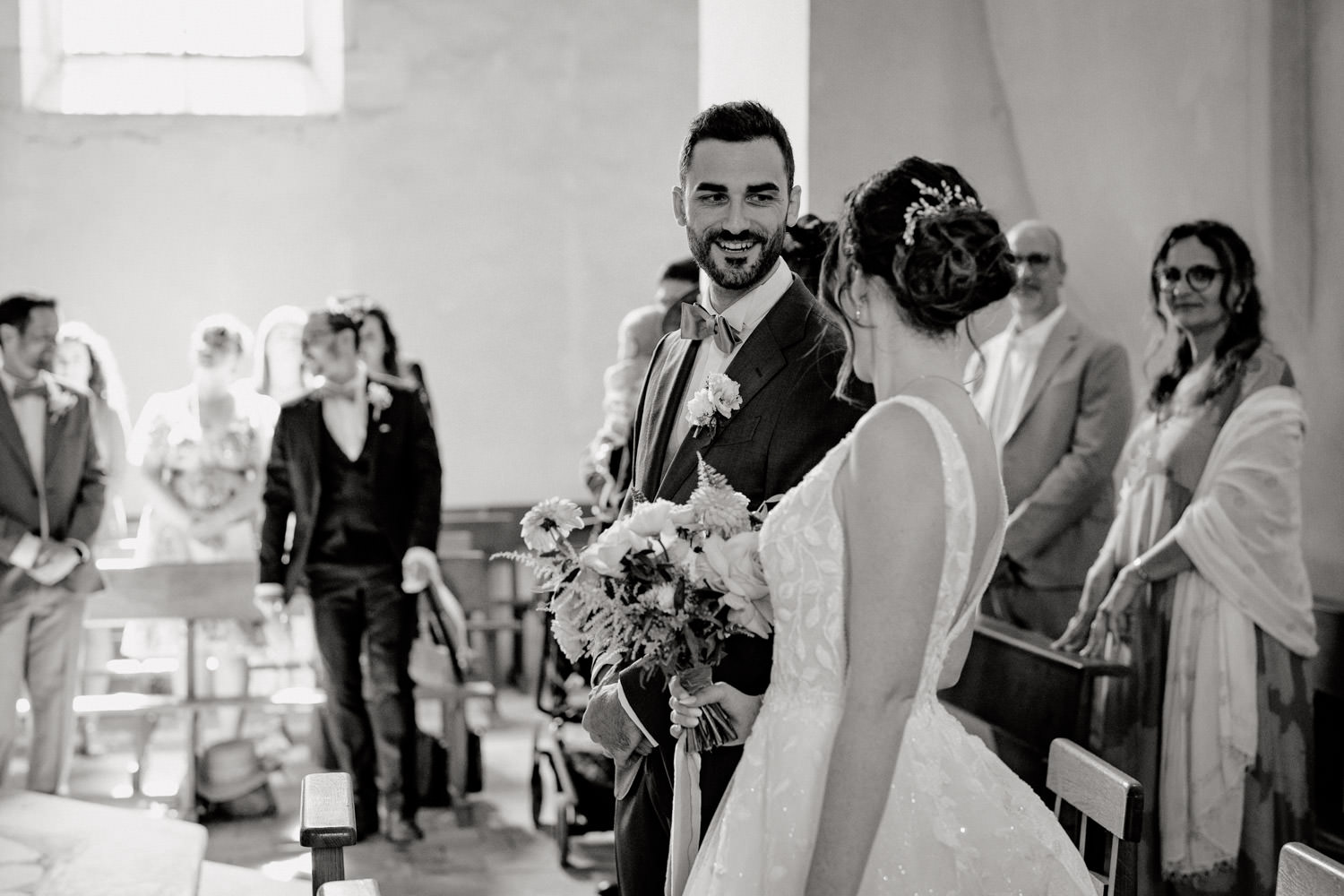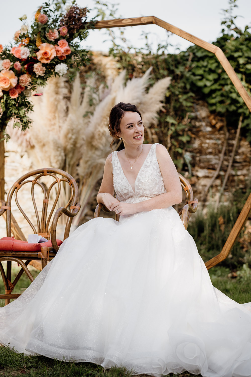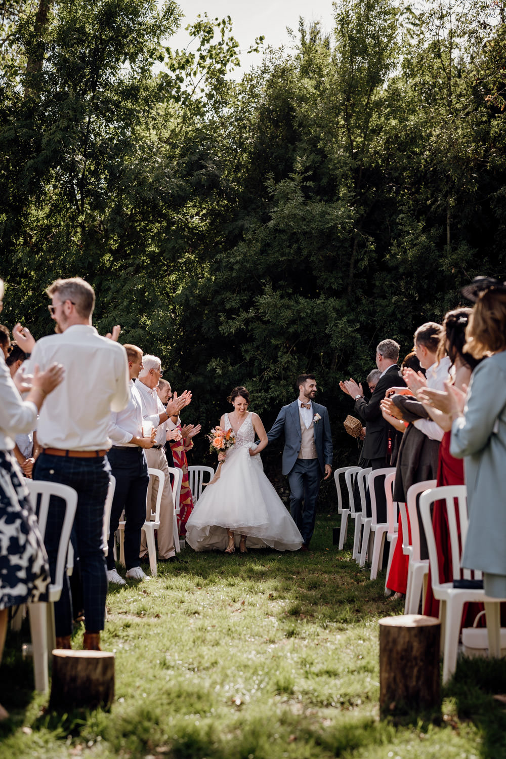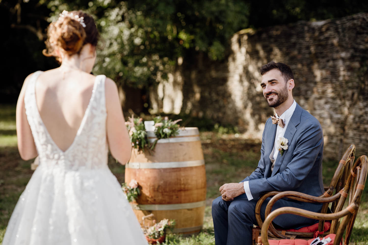 Une fois les invités installés, le cortège a débuté. Le regard du marié lorsqu’il a découvert sa future épouse restera un moment fort de cette journée. La cérémonie s’est déroulée dans une atmosphère à la fois solennelle et joyeuse. Les regards complices, les sourires, les larmes discrètes… autant d’instants précieux à capturer.