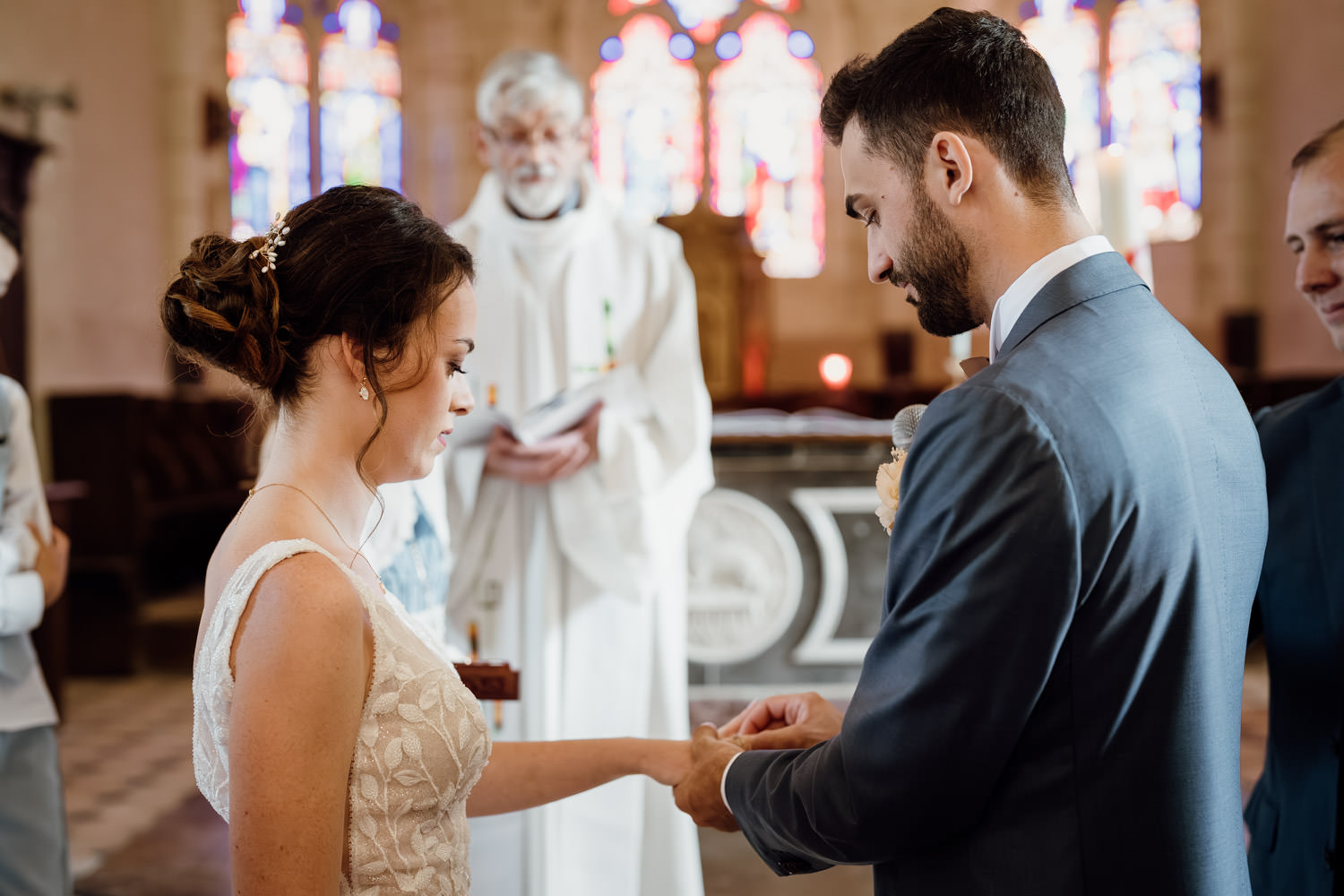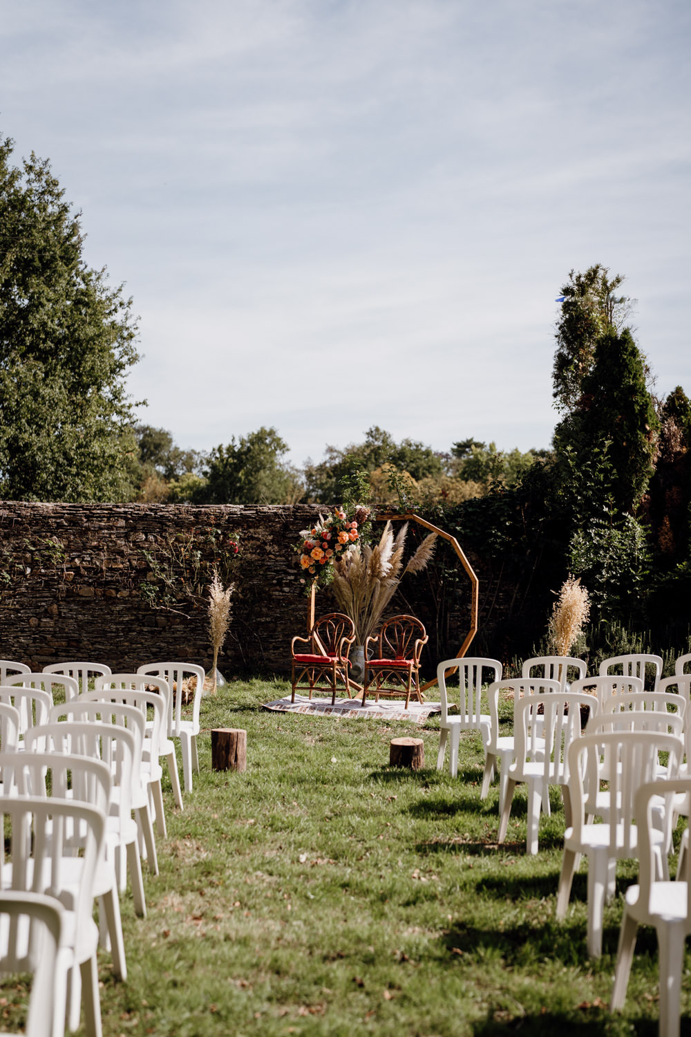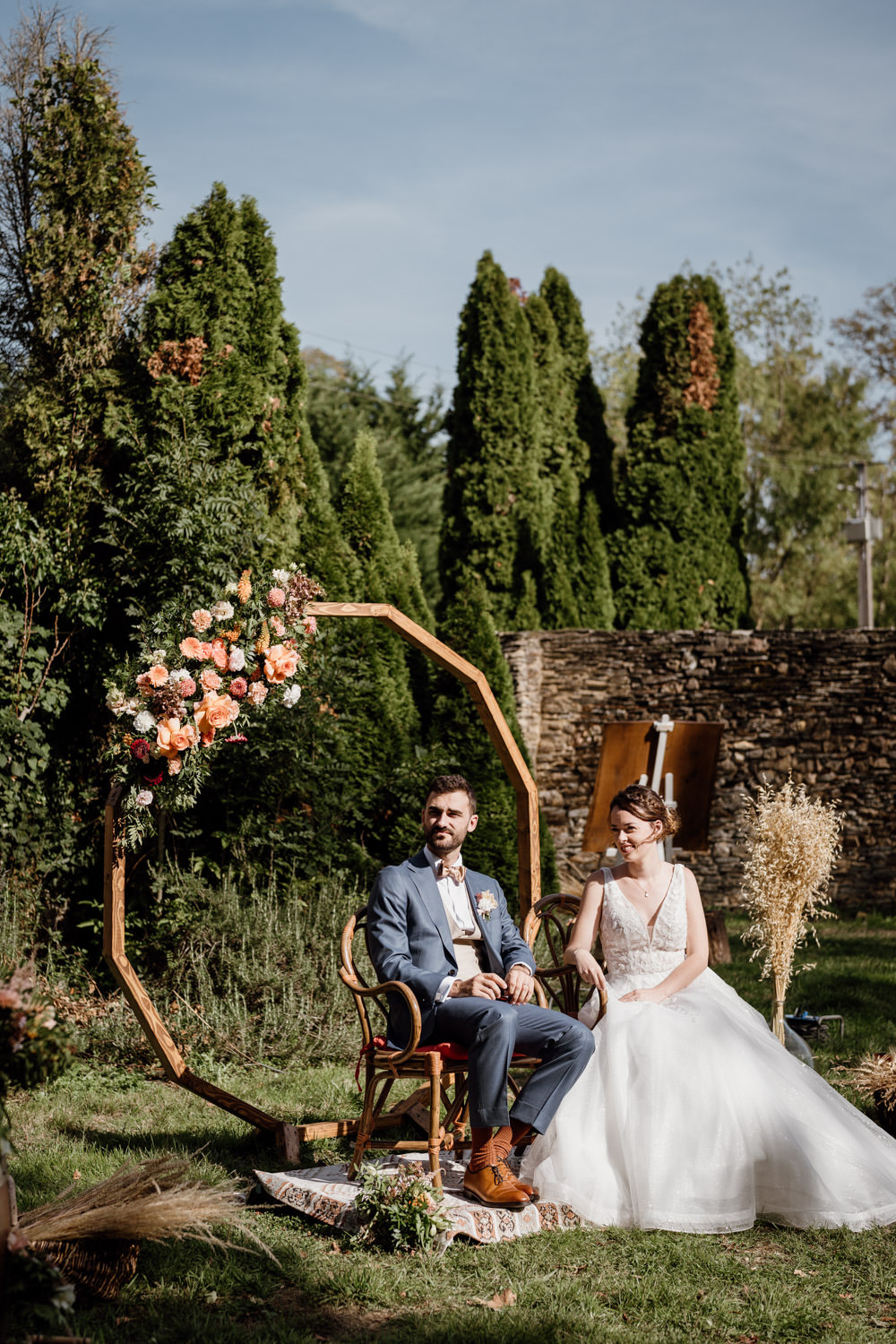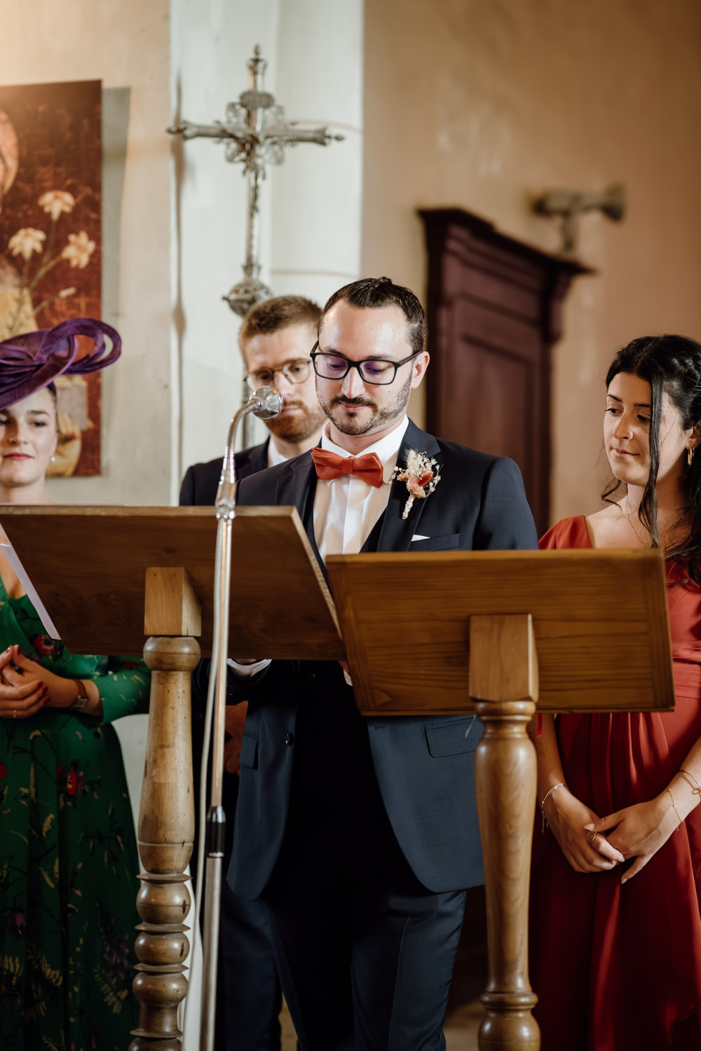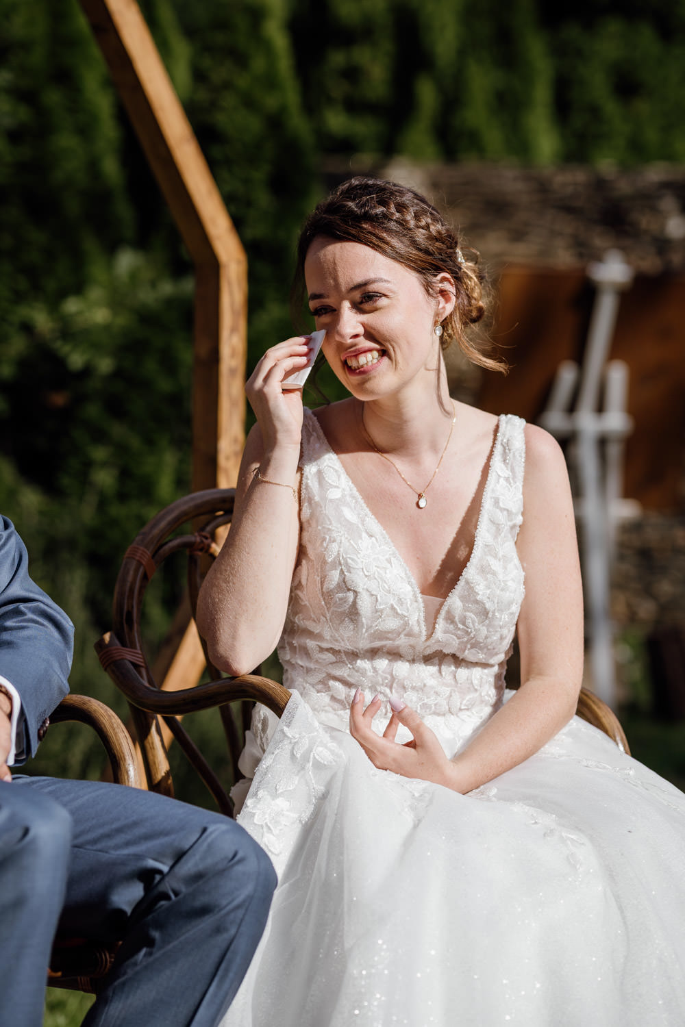 Une fois les invités installés, le cortège a débuté. Le regard du marié lorsqu’il a découvert sa future épouse restera un moment fort de cette journée. La cérémonie s’est déroulée dans une atmosphère à la fois solennelle et joyeuse. Les regards complices, les sourires, les larmes discrètes… autant d’instants précieux à capturer.