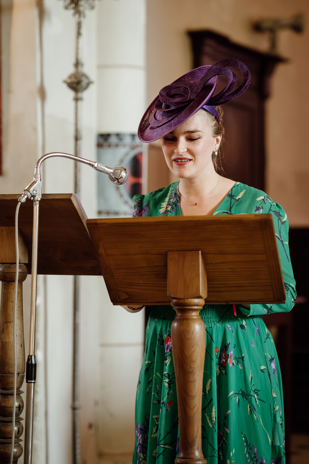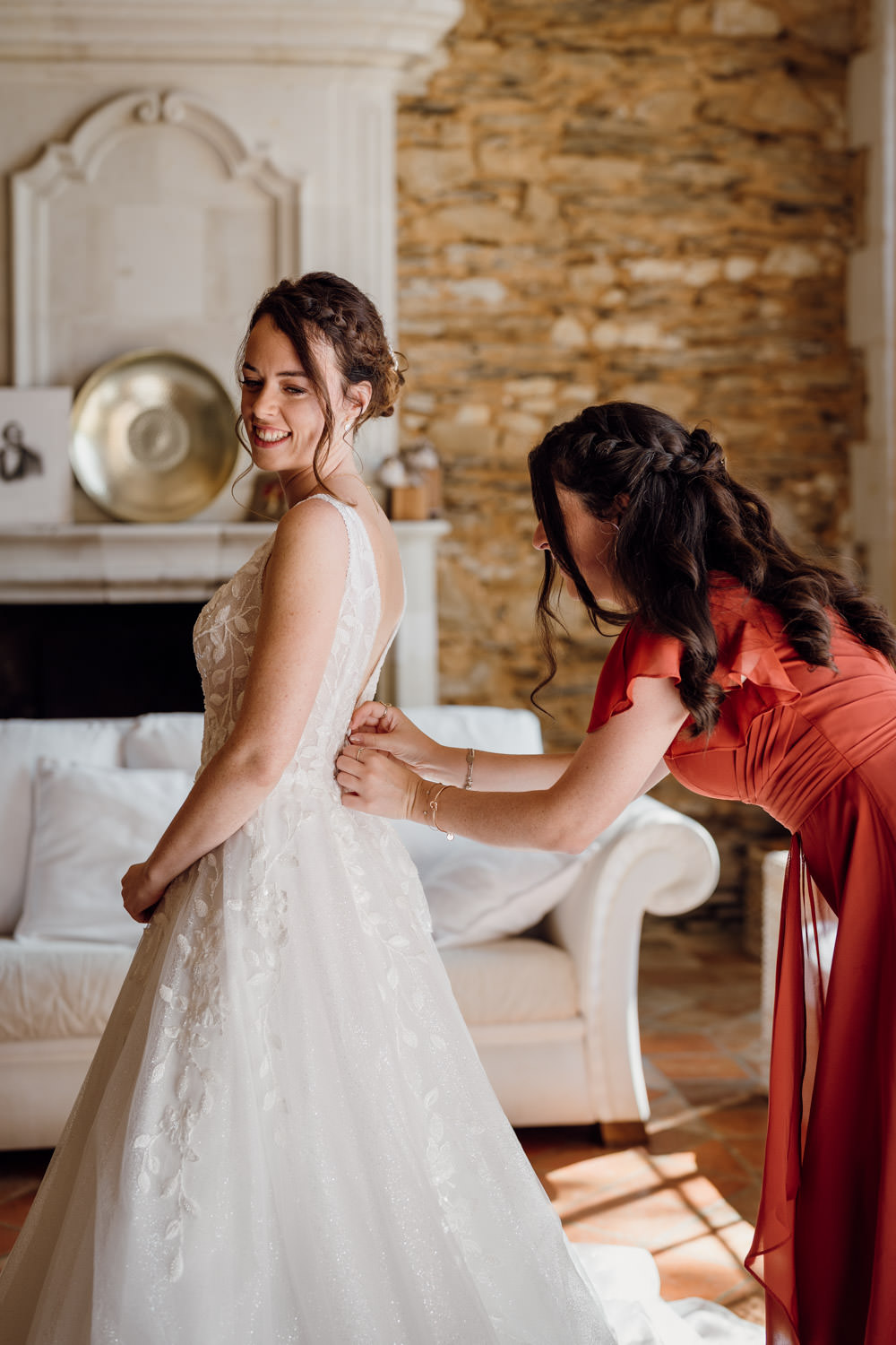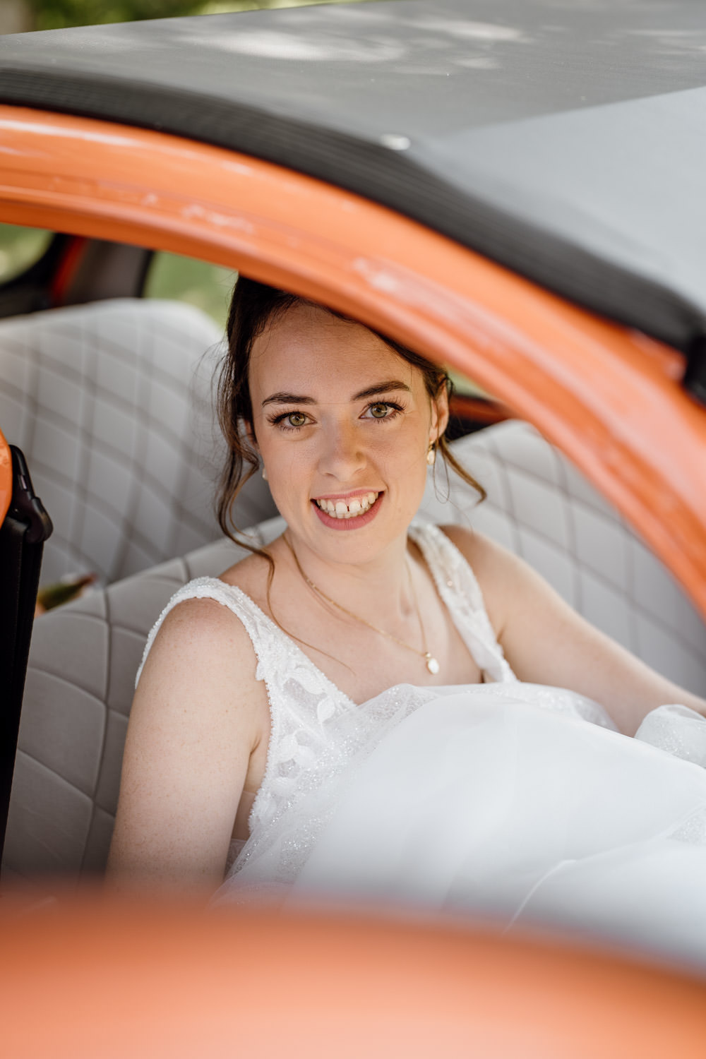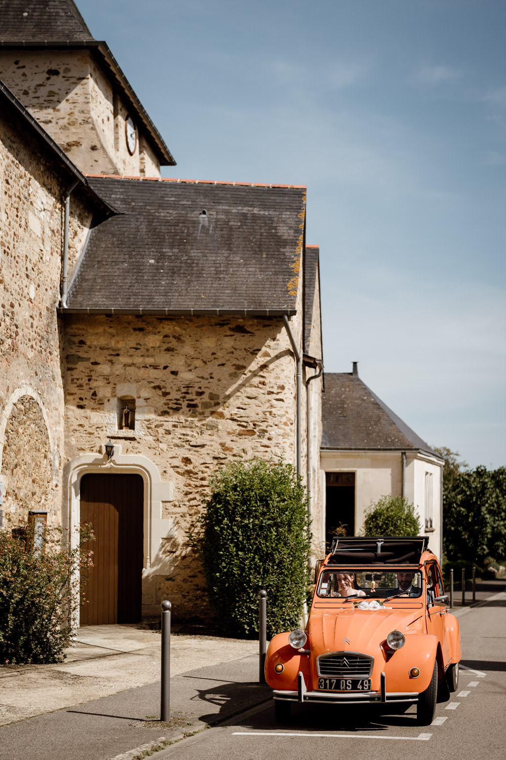 La mariée terminait son maquillage lorsque je suis entrée dans sa chambre. Sa robe était suspendue à une poutre, prête à être enfilée. Après les dernières retouches coiffure et l’ajout de ses bijoux, elle a passé sa robe entourée de ses témoins en peignoirs assortis. Elle était lumineuse. Elle a ensuite pris place dans une 2CV orange aux côtés de son père pour rejoindre l’église.
