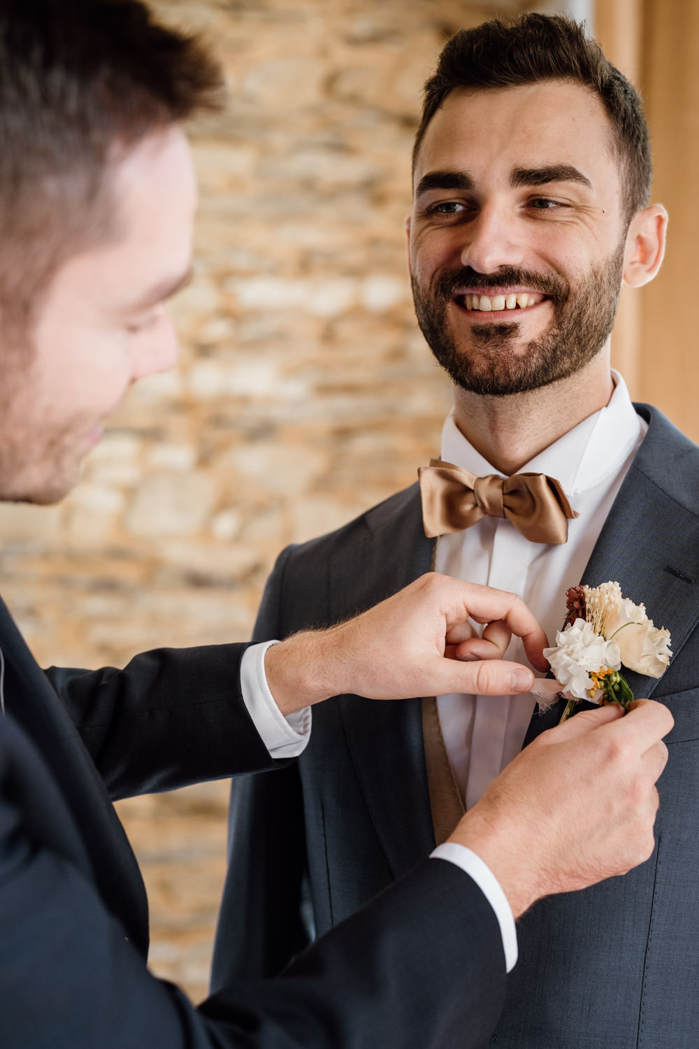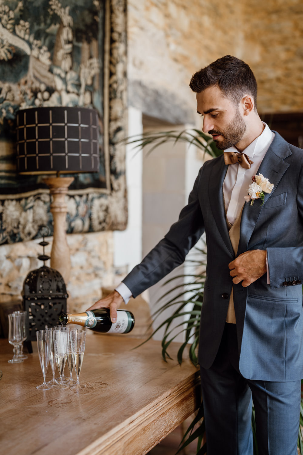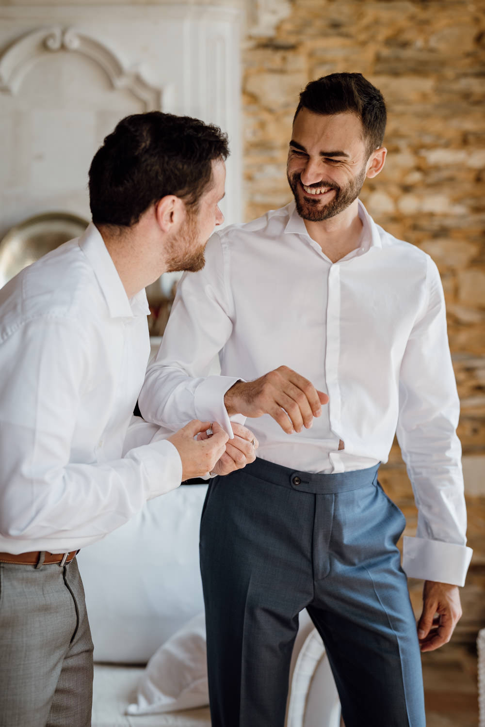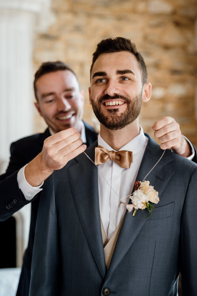Les préparatifs se sont ensuite déroulés dans la bonne humeur. J’ai adoré voir ses proches habillés pour le mariage tout en portant un peignoir par-dessus leurs tenues pour éviter la moindre tache au déjeuner ! Une technique ingénieuse que je recommande volontiers.