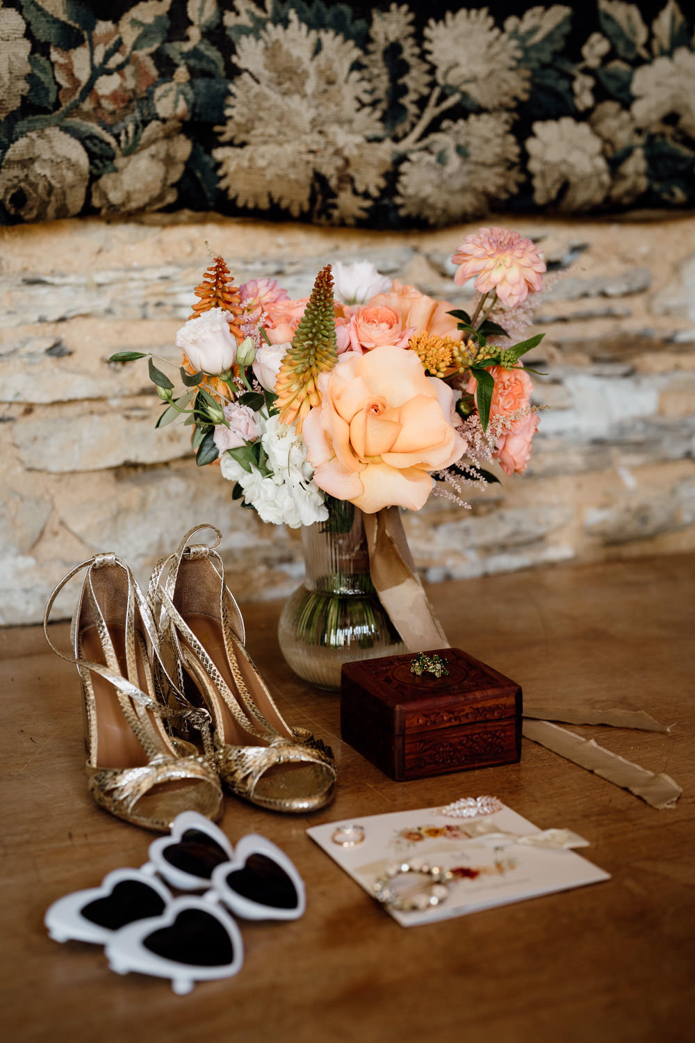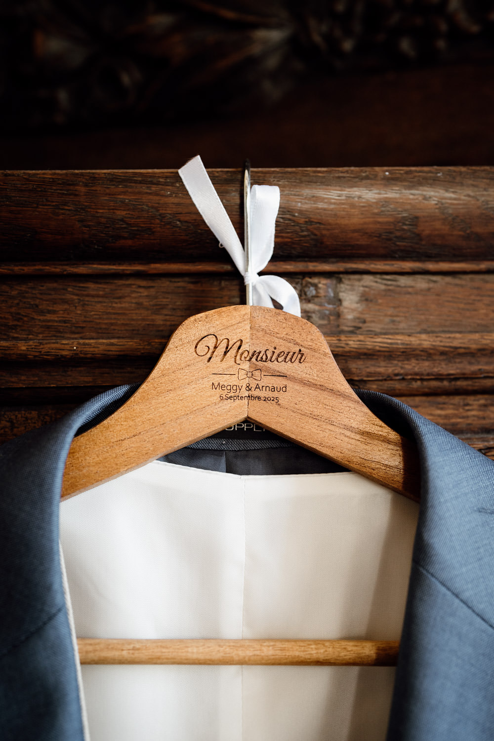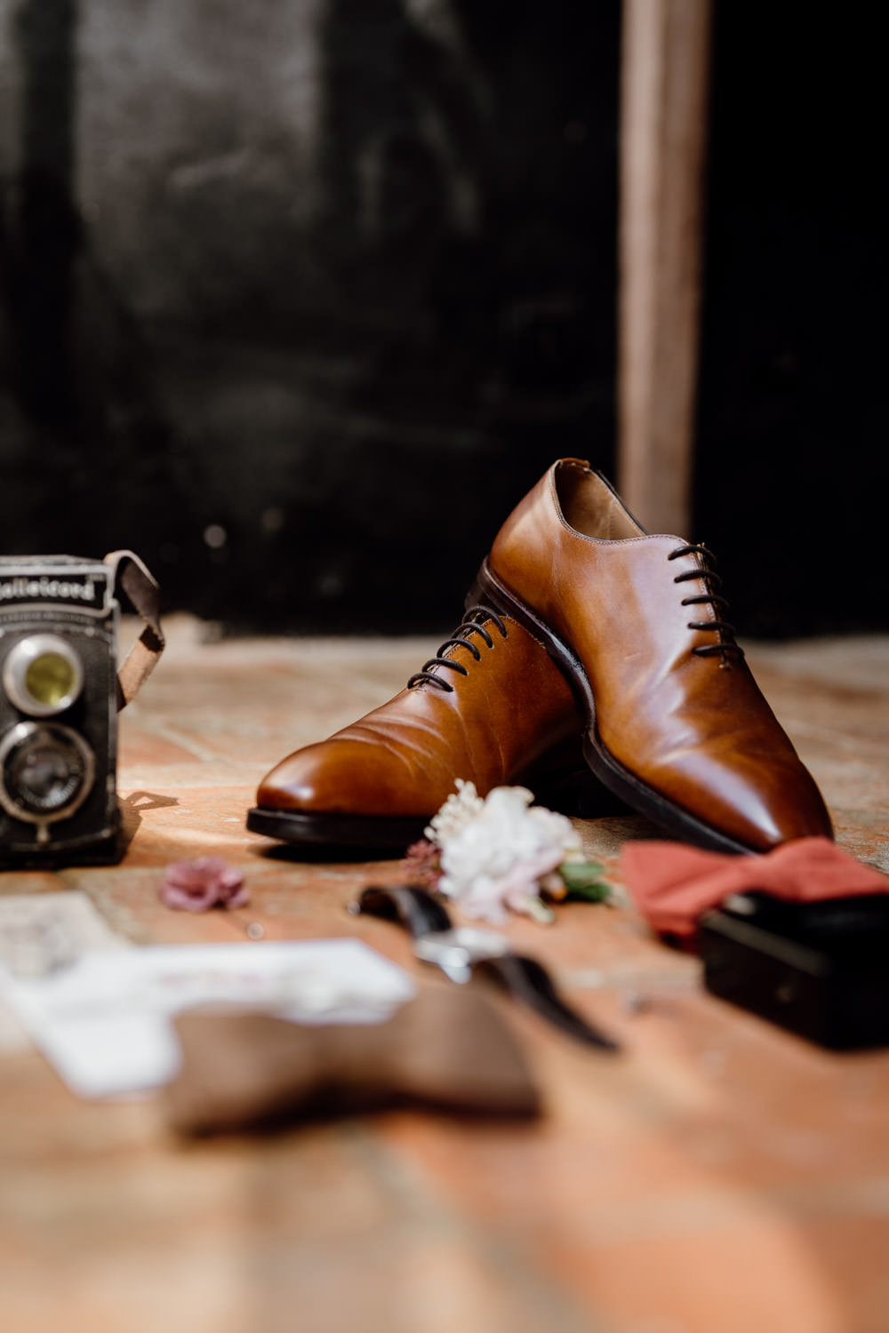 Au gîte, j’ai d’abord réuni les éléments que les mariés avaient préparés pour composer un flat lay. Le marié, ancien élève des Arts et Métiers d’Angers, avait apporté son pendentif en équerre gravé de son surnom de Gadzar’, ainsi que le vieil appareil photo de son grand-père accompagné d’un ordre de réparation datant de 1978. Des objets chargés d’histoire qui donnaient immédiatement du sens aux images.
