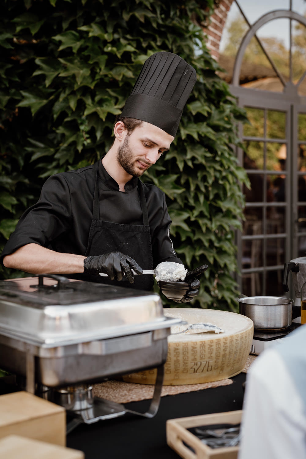 Le cocktail s’est tenu dans le jardin de l’Orangerie du Château des Briottières. Plusieurs ateliers culinaires étaient proposés, dont un risotto servi directement dans une meule de parmesan — un succès immédiat auprès des invités.