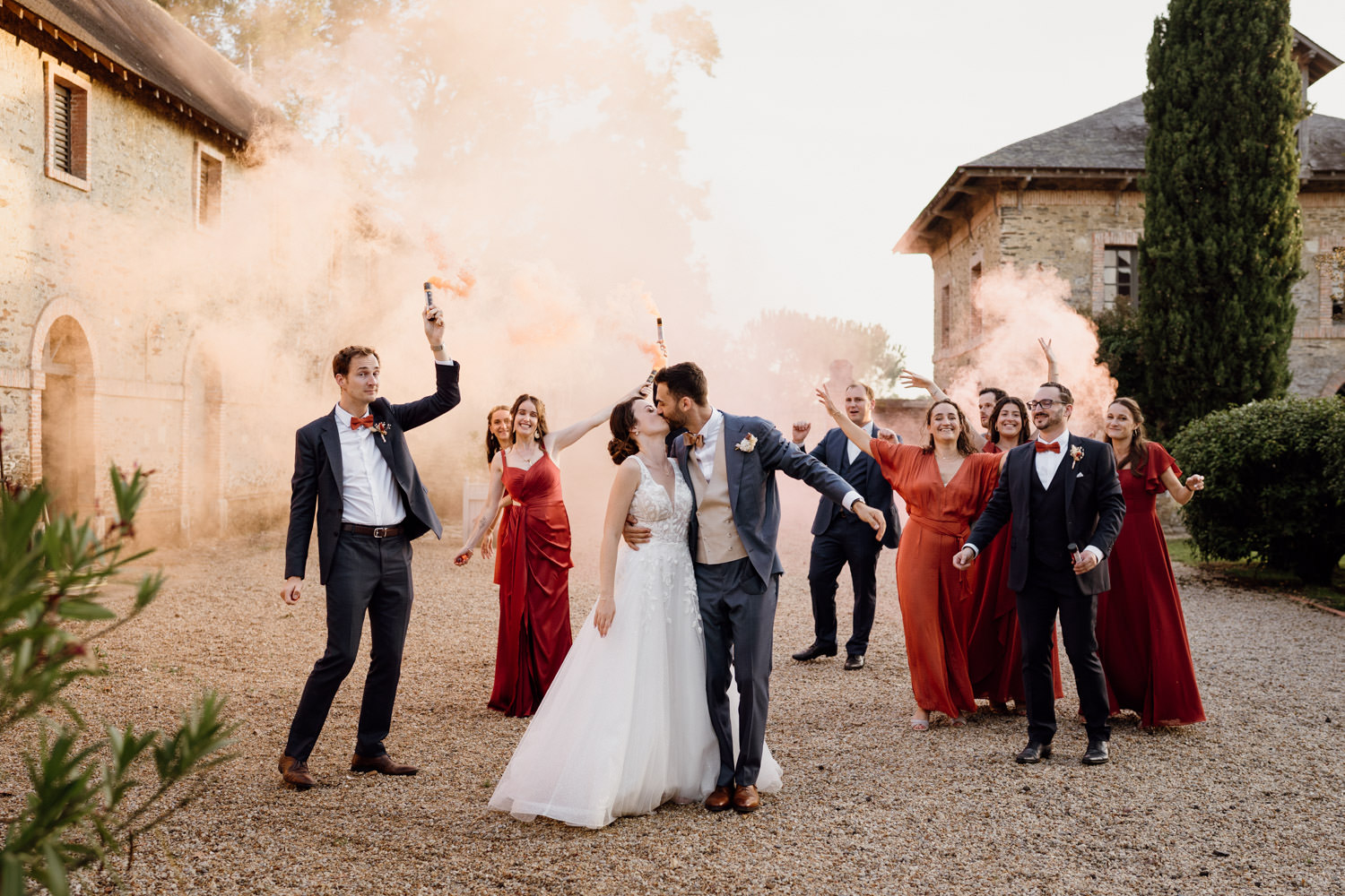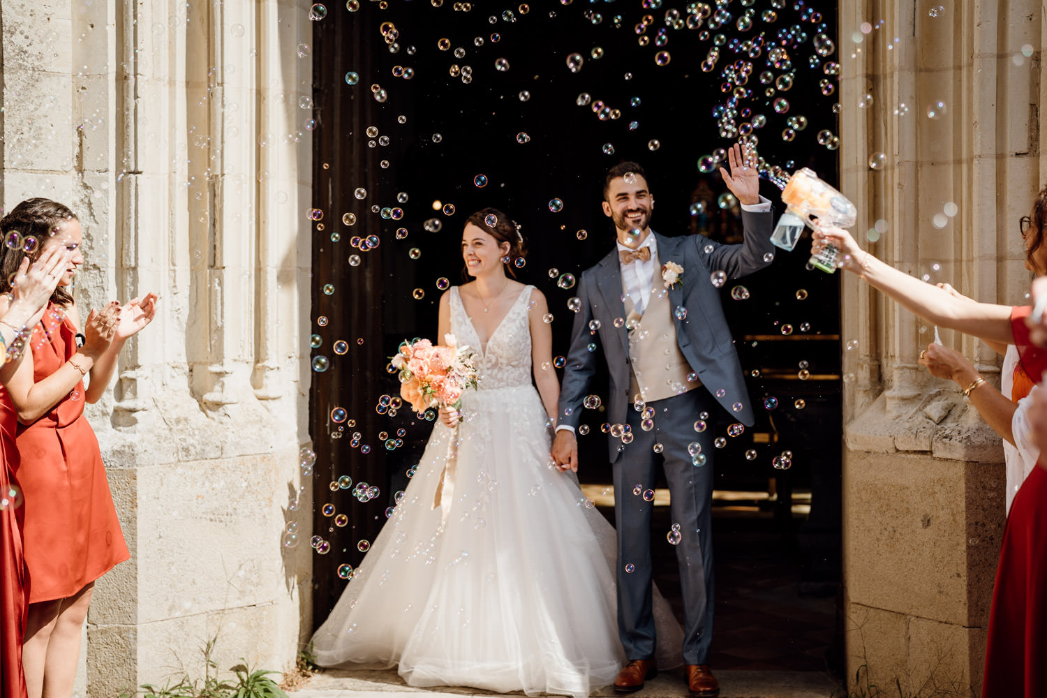À la sortie, les invités ont accueilli les mariés sous un nuage de bulles de savon, une alternative élégante aux confettis. Ils ont ensuite repris la route vers le domaine pour poursuivre leur mariage à l’Orangerie du Château des Briottières.