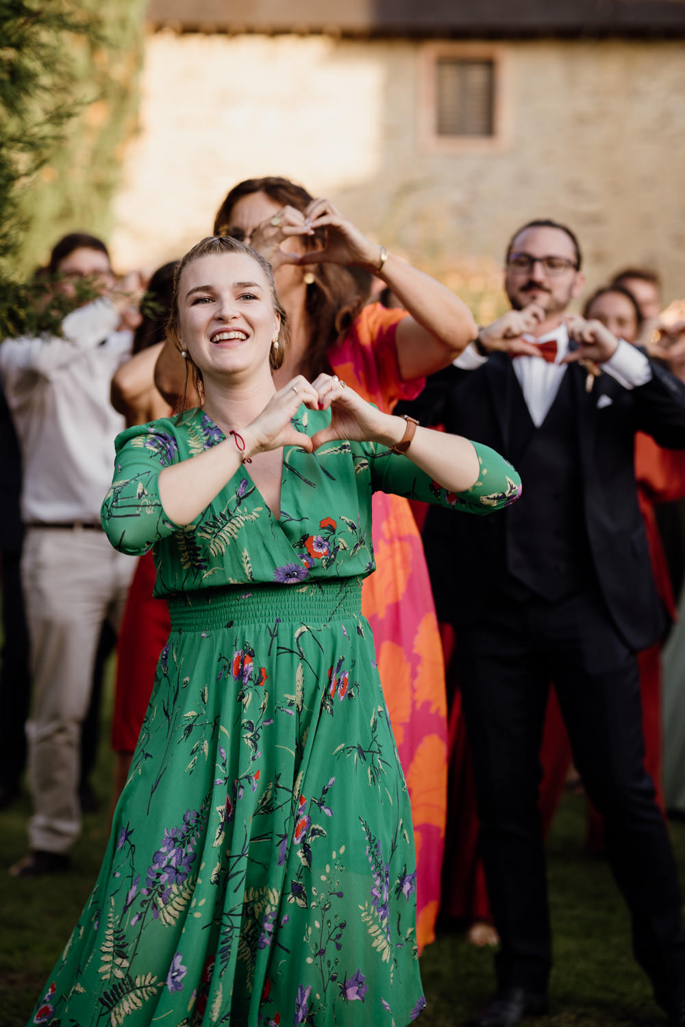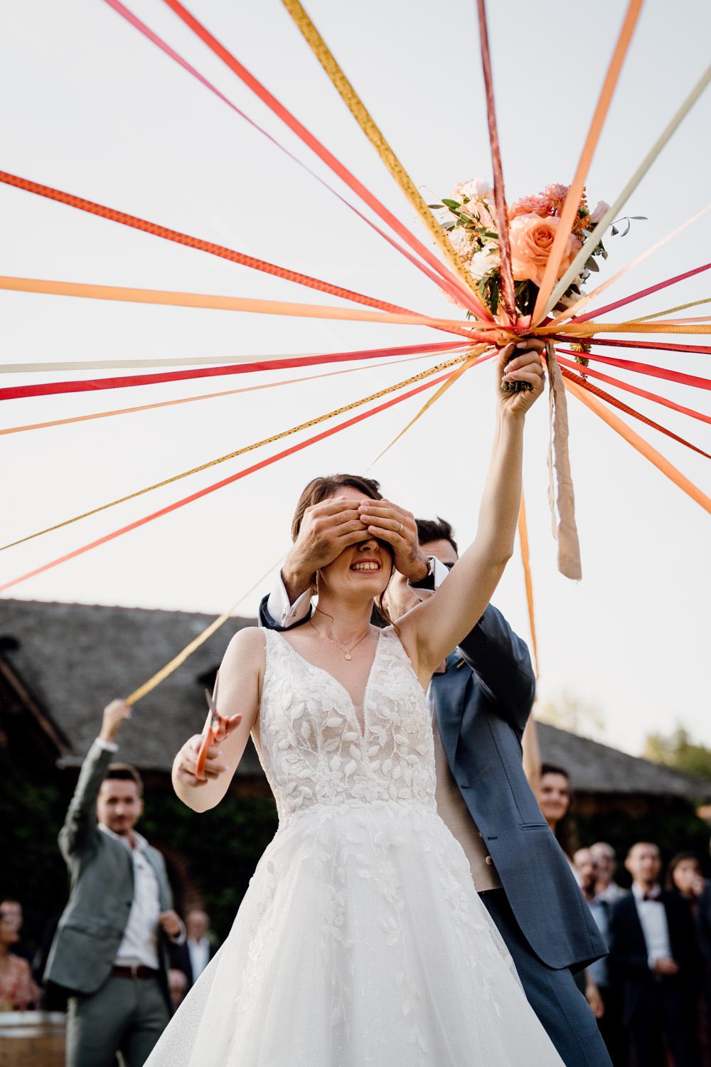Une chanteuse accompagnait ce moment, créant une atmosphère douce et élégante. Nous avons réalisé les photos de groupe prévues, organisé un flash mob surprise, puis le traditionnel jeu du ruban.